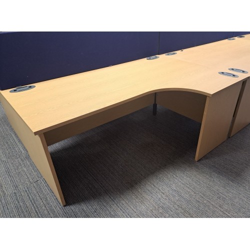 Secondhand Light oak 1800mm by 1200mm radial desks with matching mobile pedestals From Evans Trading, the Specialist in Recycled Office Furniture